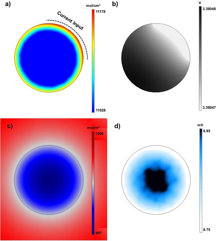 a) Charged state; b) Electrical potential; c) Lithium concentration; d) Voltage.