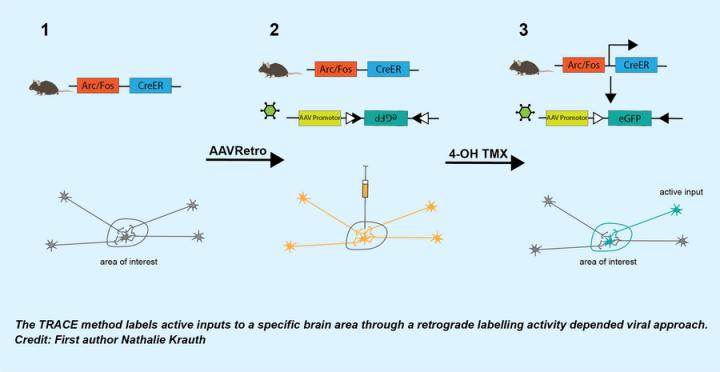 A collaborative study led by circuitry experts at the department of Molecular Biology and Genetics, department of Biomedicine and centre of Proteins in Memory unravel a new approach or so to say, an unbiased and accurate strategy, that selectively tags arriving inputs that are activated by a defined stimulus and projected to a particular brain region. The researchers' new approach (TRACE) uses an approach where a retrograde virus is combined with a Cre-recombinase that is under the control of an activity dependent promoter to express a fluorescent marker in input neurons.