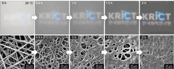At low temperatures, this nanofiber film has a stable structure where thin threads intersect each other and thus appears opaque because the light is scattered. However, when exposed to room temperature for a certain period of time, this nanofiber structure collapses. More specifically, these thin threads start to melt and become entangled with each other. This allows light to transmit through the film, thereby making it appear transparent.