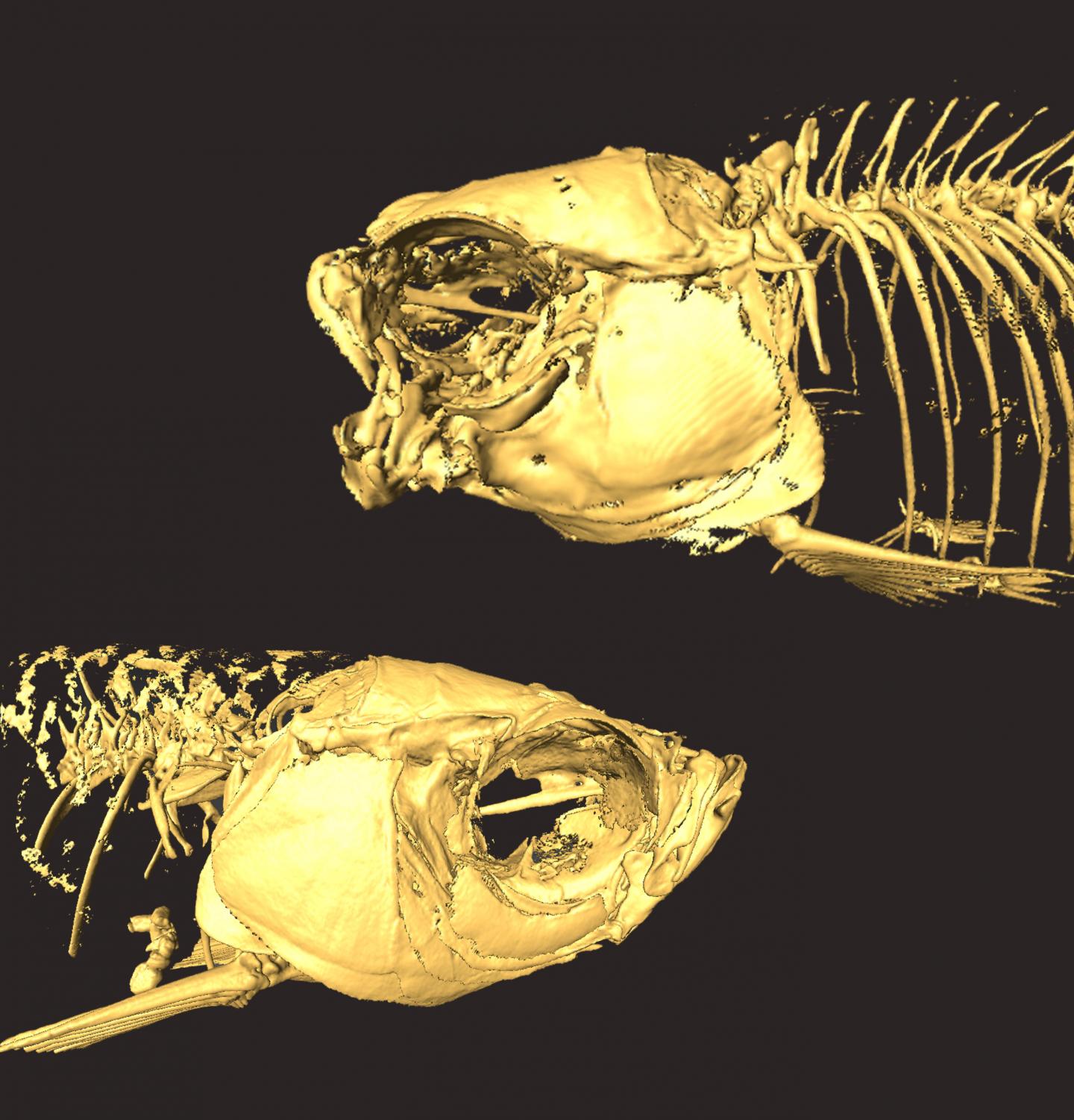 image: Skeleton of a mutant (top) and normal zebrafish, showing the structural differences with the jaw.