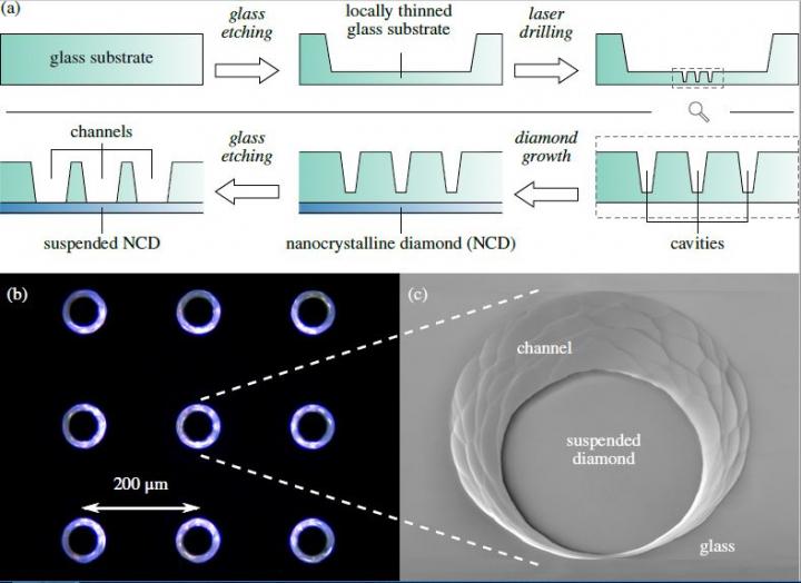 Next, the scientists grew a 175-nanometer thick nanocrystalline diamond film on the other side of the glass and transformed the drilled cavities into small channels sealed with suspended diamond. Combining diamond and glass creates a transparent structure in which scientists can grow and visualize living cells.