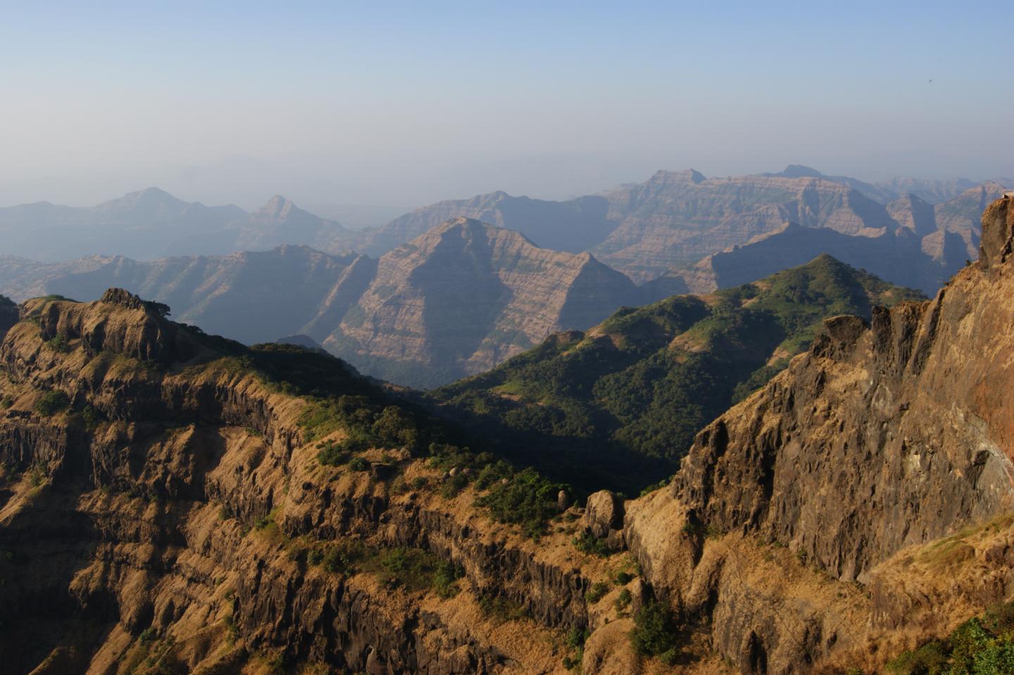 image: A view of the cliffs cutting through the Deccan Traps from near Mahabaleshwar, illustrating the dramatic landscape and thickness of the basaltic pile, which reaches over 11,000 feet. Princeton geoscientists Blair Schoene and Gerta Keller led an international team of researchers who have assembled the first high-resolution timeline for the massive eruptions in India's Deccan Traps, determining that the largest eruption pulse occurred less than 100,000 years before the mass extinction that killed the (non-avian) dinosaurs.