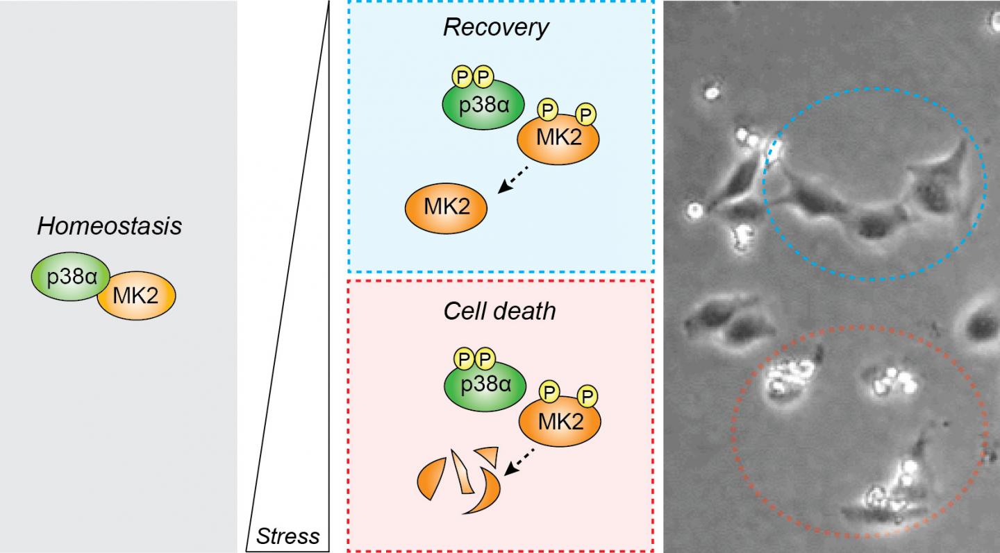 When cells are exposed to high levels of stress, the p38-MK2 pathway is activated in a sustained manner, promoting the degradation of the MK2 protein, which correlates with cell death. However, moderate levels of stress trigger only a temporary activation of the p38-MK2 pathway, which allows the re-accumulation of MK2 and leads to cell survival. Thus, MK2 protein levels act as a molecular indicator that informs cells whether to stay alive or to initiate self-destruction.