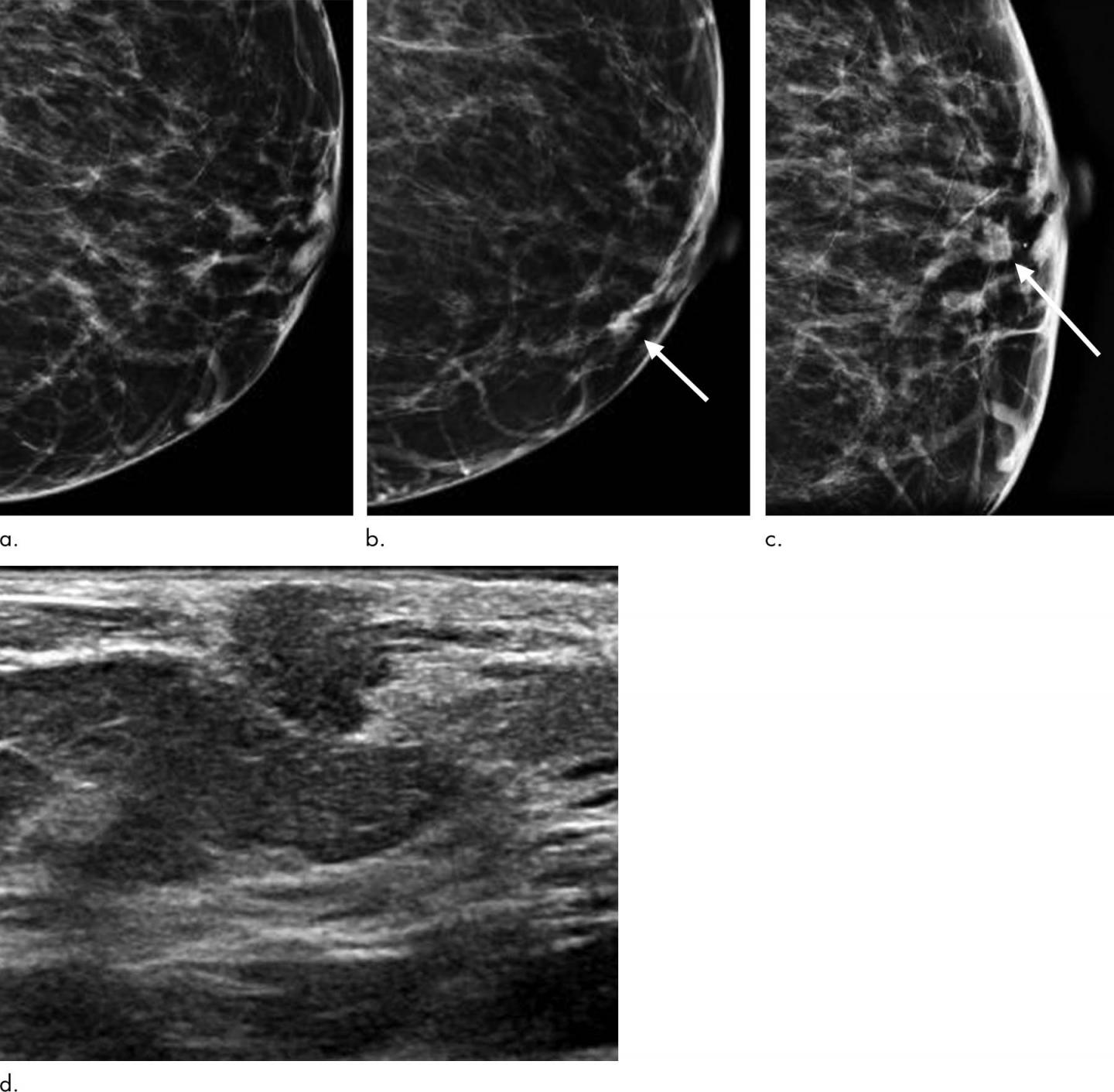 image: Images show symptomatic false-negative cancer in a 73-year-old black woman who presented with a palpable abnormality 64 days after negative screening mammography. (a) Negative screening left digital breast tomosynthesis (DBT) mammogram. (b) Diagnostic DBT mammogram shows a new palpable mass (arrow). (c) Spot-compression DBT mammogram enables confirmation of mass (arrow). (d) Ultrasound (US) image shows hypoechoic mass with angular margins. Subsequent US-guided biopsy revealed estrogen receptor- and progesterone receptor-positive and human epidermal growth factor receptor 2-negative invasive ductal carcinoma.