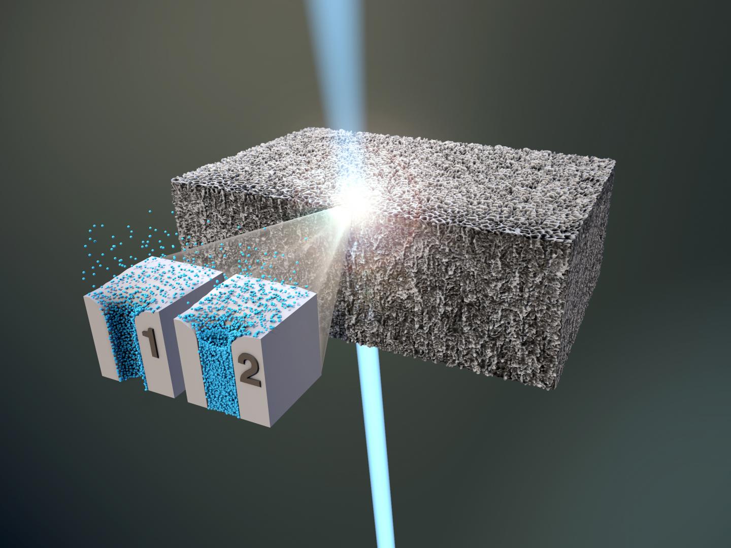 image: From the measurement data, the team was able to determine that the xenon atoms first accumulate on the inner walls of the pores (state 1), before they fill them up (state 2). The X-ray beam penetrates the sample from below.