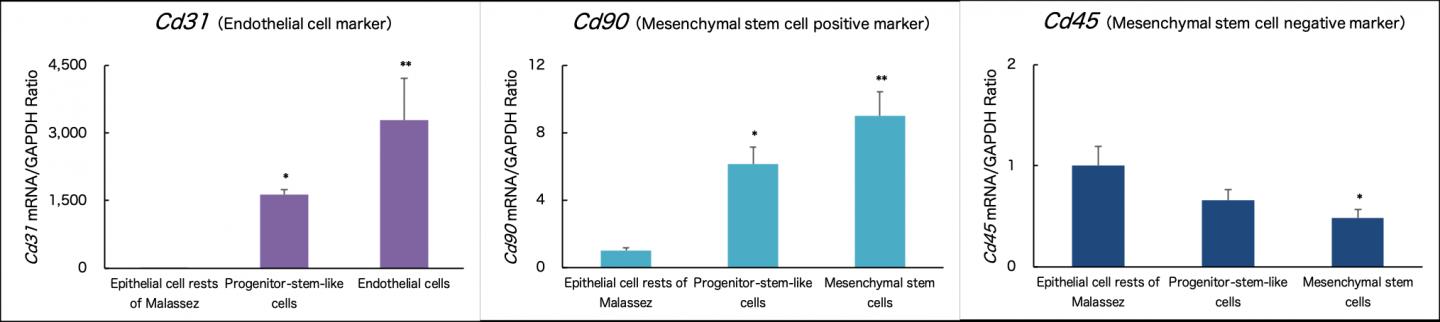 image: The expression levels of Cd31, a marker for endothelial cells, and Cd90, a marker for mesenchymal stem cells, in the endothelial- and mesenchymal stem cell-like cells differentiated from progenitor-stem-like cells were similar to those in the endothelial and mesenchymal stem cells.
