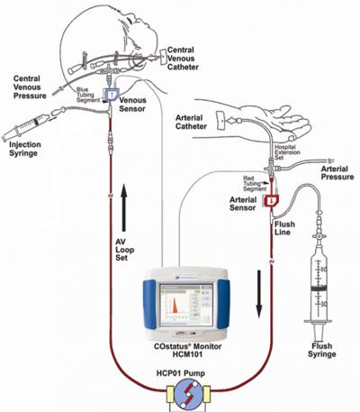 The research team recruited 12 newborns younger than 2 weeks old who already had central venous and arterial access. The venous line of the arteriovenous AV loop is connected to the umbilical venous catheter while the COstatus monitor's arterial line is connected to the umbilical arterial catheter. During measurement sessions, two injections of solution are injected into the venous loop, allowing for two measures of cardiac output, cardiac index, active circulating volume index, central blood volume index and systemic vascular resistance index.