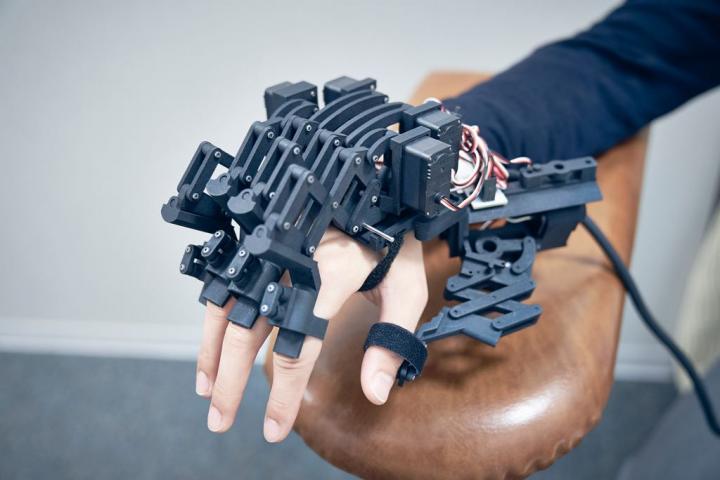 image: An attachable device, so called an exoskeleton, that mechanically moves the user's fingers using a motor.