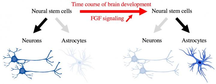 image: In the process of fetal brain development, neural stem cells generate both neurons and astrocytes. Neurons are formed first (left) and astrocytes later (right). The present study has revealed the cell fate switch from neurons to astrocytes to be FGF signaling.