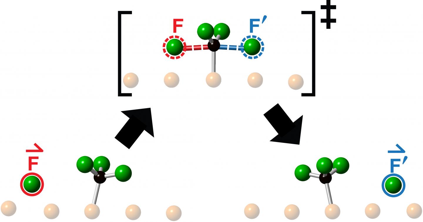The researchers studied collisions obtained by launching a fluorine atom at the centre of a fluoromethyl molecule - made up of one carbon atom and three fluorine atoms - and observed the resulting reaction using Scanning Tunneling Microscopy. What they saw following each collision was the ejection of a new fluorine atom moving collinearly along the continuation of the direction-of-approach of the incoming fluorine atom.