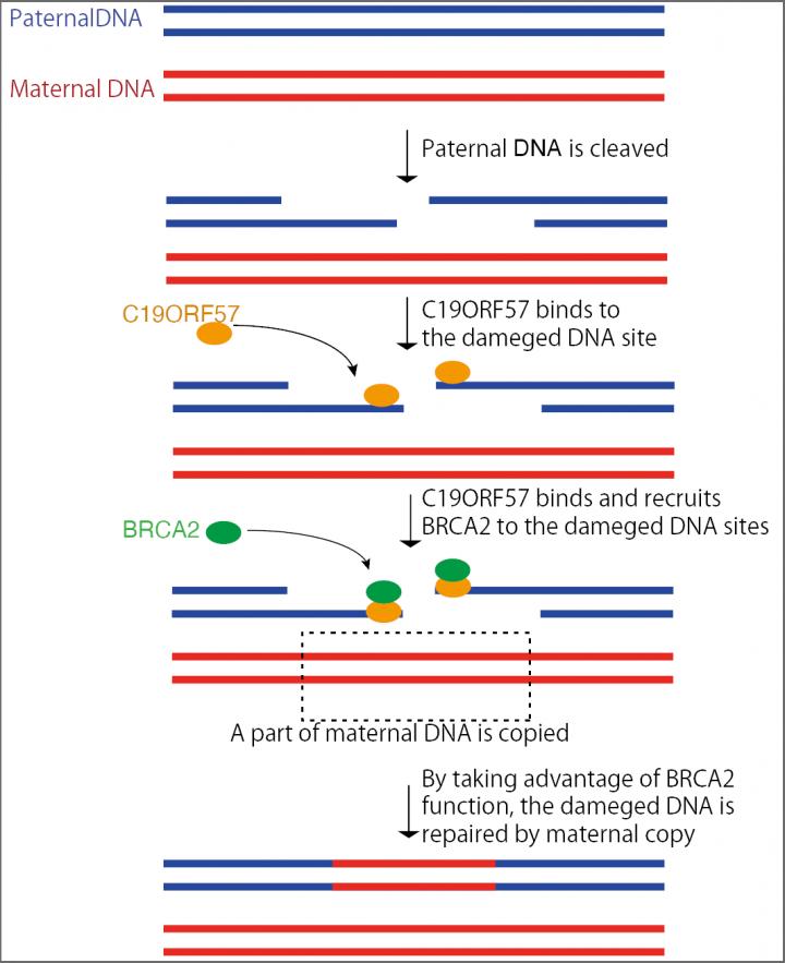 The researchers set out to clarify the role of C19ORF57 in meiosis. Using mass spectrometry, the group found that it binds to breast cancer suppressor BRCA2, a protein that is known to play a role in repairing damaged DNA. This data suggests that C19ORF57 and BRCA2 function together in germ cells.