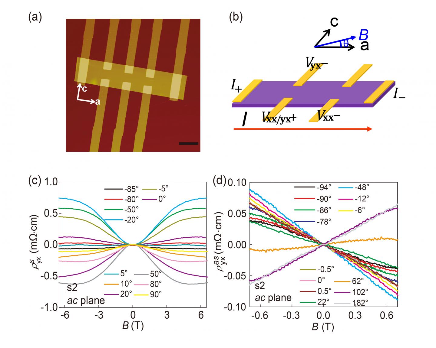 The research team performed systematic transport measurements on ZrTe5 devices (Fig. 1(a)) in both Physical Property Measurement System and a dilution refrigerator with triple axes vector magnet. With well-controlled angular-dependent transport measurements (Fig. 1(b)), the research team excluded the extrinsic influence of longitudinal resistance and classical Hall effect, and detected intrinsic in-plane Hall response of ZrTe5 devices. The observed in-plane Hall signal of ZrTe5 devices contains both symmetric (Fig. 1(c)) and asymmetric (Fig. 1(d)) components with respect to the magnetic field. More interestingly, nonzero in-plane Hall signal is detected for B?I (Fig. 2(a-c)) and B?I (Fig. 2(d-f)) situations. These discoveries are beyond the expectations of classical Hall effect and previously suggested PHE in topological materials.