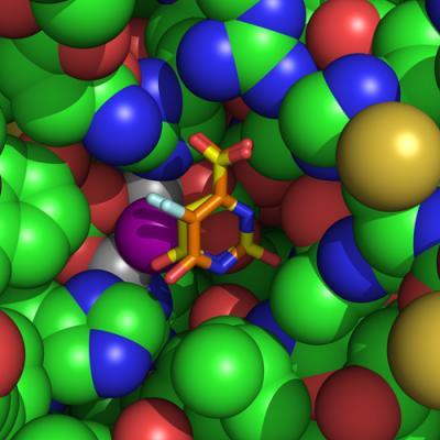 This schematic picture shows a potential drug against the resistant bacteria, A. baumannii, interacting with a drug target identified by the UB and HWI researchers.