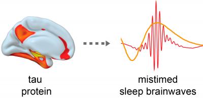 The team also made a second discovery. They found that people with high levels of tau protein in the brain were more likely to lack the synchronized brain waves that are associated with a good night's sleep. The synchronization of slow brain waves throughout the cortex of the sleeping brain, in lockstep with bursts of fast brain waves called sleep spindles, takes place during deep or non-rapid eye movement (NREM) sleep. The team reported that the more tau protein older adults had, the less synchronized these brain waves were. This impaired electrical sleep signature may therefore act as a novel biomarker of tau protein in the human brain.