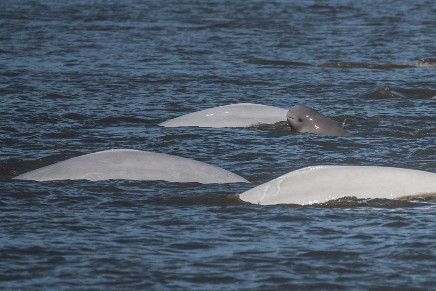 image: A gray beluga whale calf with three adults in Cook Inlet, Alaska. NMFS ESA/MMPA Permit #20465.