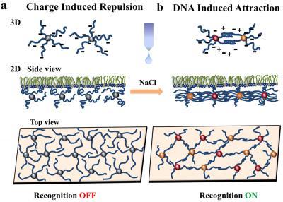 This is a schematic illustration of the assembly of DNA-functionalized nanoparticles (NPs) at positively charged interfaces. (a) In the absence of salt, interactions are dominated by the electrostatic repulsion between DNA chains. (b) The 2D assemblies can be altered by programming the interactions between the NPs. By introducing monovalent salt, an attractive interaction between the NPs is switched ON, due to DNA hybridization. Change in interaction between NPs provides the path to tune the structure of the 2D assemblies at the interface.