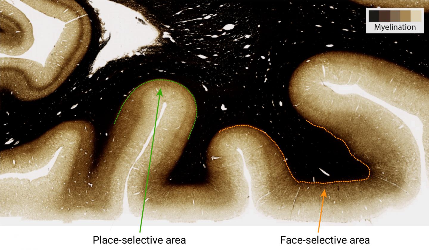 image: Higher myelination (darker stain) is found in the face-selective area of higher visual cortex, as compared to place selective area.