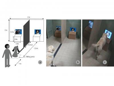 These images show:a: Apparatus.b: The dog sits in front of the experimenter, on a line between two screens.c: When hearing an order, the dog expressed his choice by going to a given screen and putting his paw in front of the chosen image.