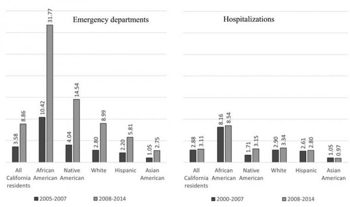 Time series for the study were divided into pre-recession (January 2000-November 2007) and recession/post-recession (December 2007-September 2015) periods. Blacks were more than three times more likely to suffer domestic violence during the recessionary period when compared with other segments of the California population, according to the data. Statistics showed that there were 3.58 emergency room visits per 100,000 population compared to 10.42 emergency visits per 100,000 people for Blacks. Hospitalization rates remained relatively similar from the pre-recession as compared to the recession/post-recession period except for Native Americans, which nearly doubled.