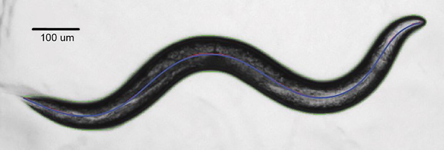 image: An image of a nematode captured by the team's new microscope. The blue line is the worm's centerline as reconstructed from a spline-based 14-parameter representation.