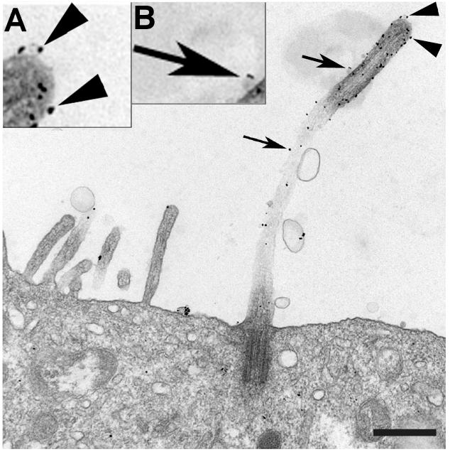 image: Immunogold labeling of Exoc5-myc (a component of the exocyst) in MDCK cells shows black dots along the primary cilium (arrowheads) and associated vesicles (arrows). The image was taken at 53,400X magnification.