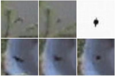 The ivory-billed woodpecker was thought to have duck-like flaps in which the wings remain extended throughout the flap cycle. One of the videos revealed radically different flaps in which the wings are folded completely closed in the middle of the upstroke. The images from the video show the wing motion from two angles. The photo in the upper right, which was obtained by James Tanner in 1939, shows an Ivory-billed Woodpecker in flight and contains a clue suggesting that there had been a misconception about the flap style.