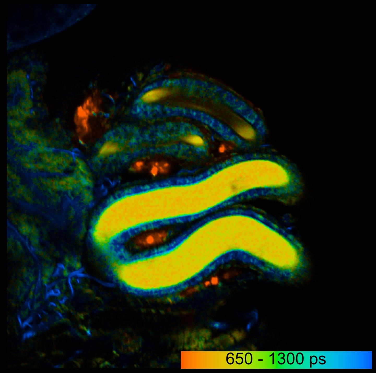 image: False-colour image of the fluorescence lifetime of the metabolic coenzyme NADH in sperm mass (here in yellow) in a female sperm storage organ in the fruit fly.