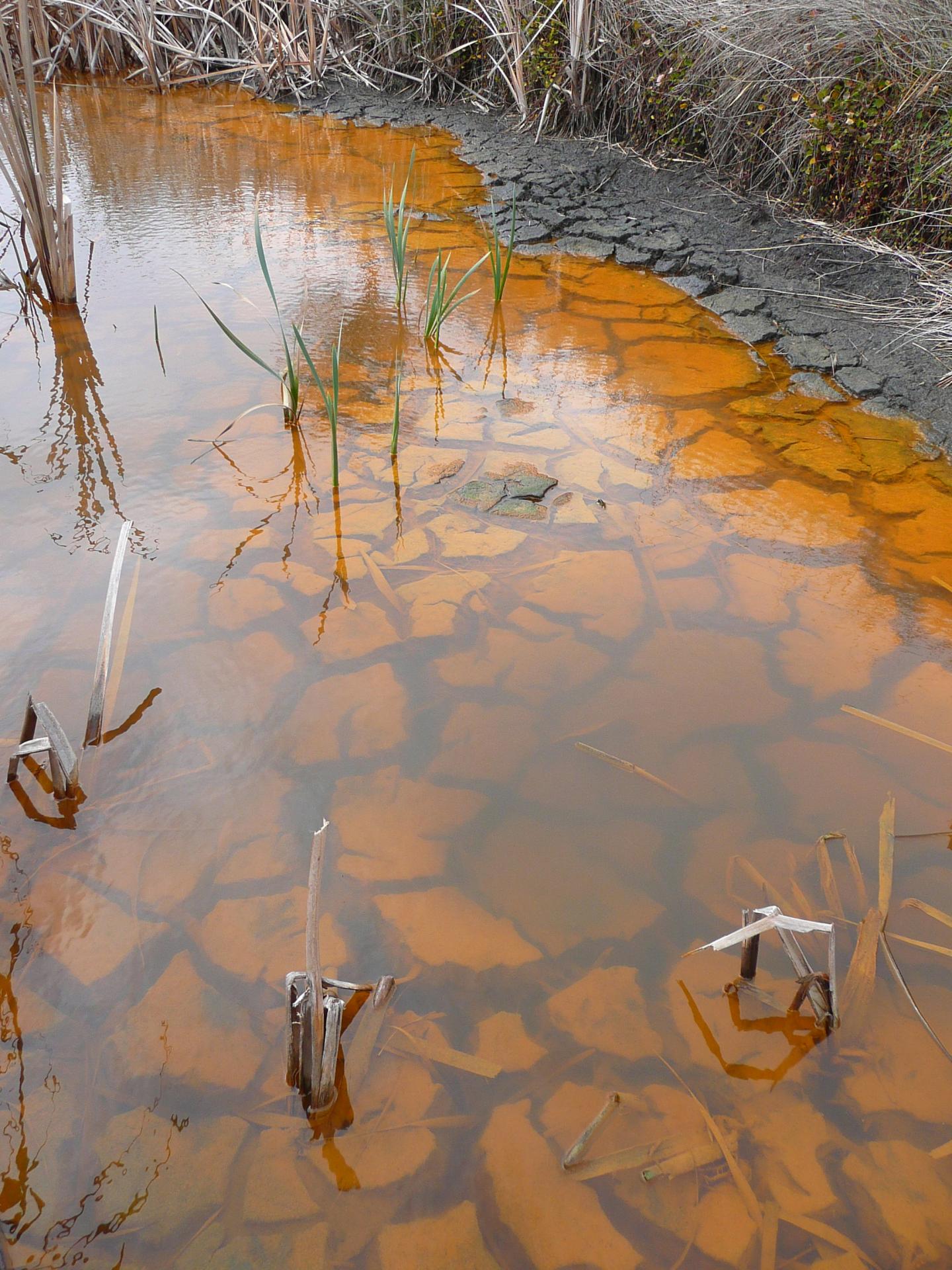 image: Acidic (pH 4) and iron rich (indicated by orange-brown colour) water in a wetland following exposure during drought