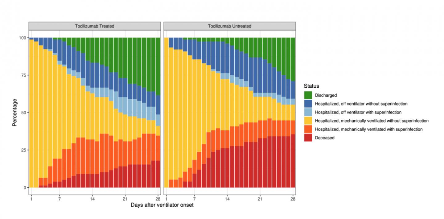In all, 54% of the tocilizumab patients developed a secondary infection, mostly ventilator associated pneumonia; 26% of those who didn't receive tocilizumab developed such infections. Such "superinfections" usually reduce the chance of survival for COVID-19 patients.