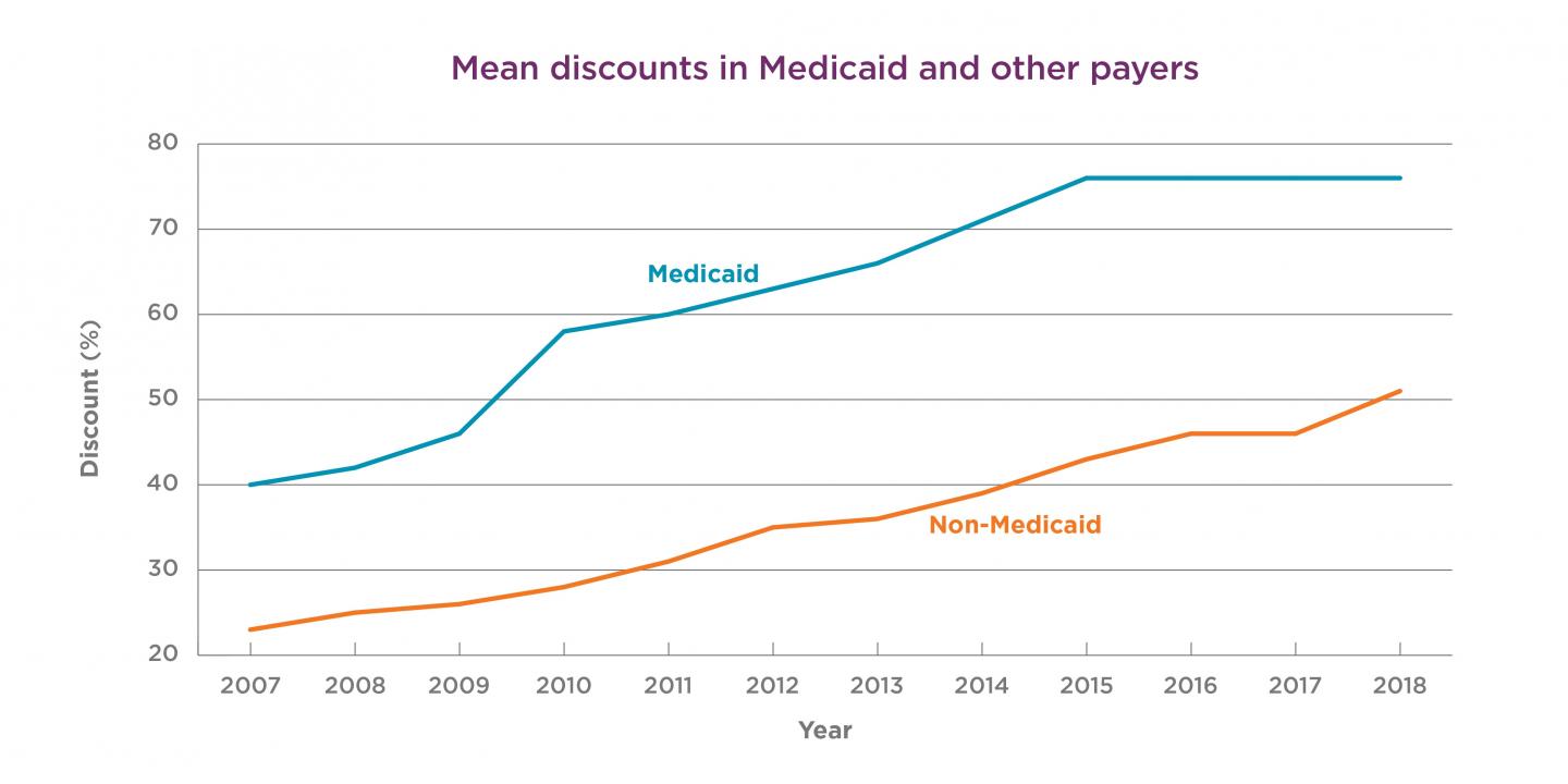 image: Medicaid discounts remain higher than for all other insurance types from 2007 to 2018.