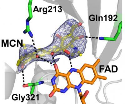 Researchers examined the structure and performance of seven forms of a protein called TetX2 that had evolved to allow E. coli to resist attacks by the antibiotic minocycline. This image shows how a molecule of the drug, shown in yellow and gray, fits within the active site of a TetX2 protein.