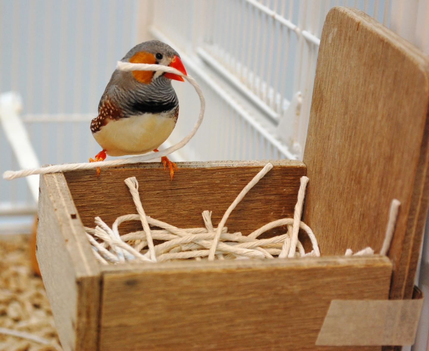 image: A male zebra finch constructing a nest. A new study is examining how early life experiences have a big impact on the birds' construction of their first homes. Photo courtesy of Alexis Breen.