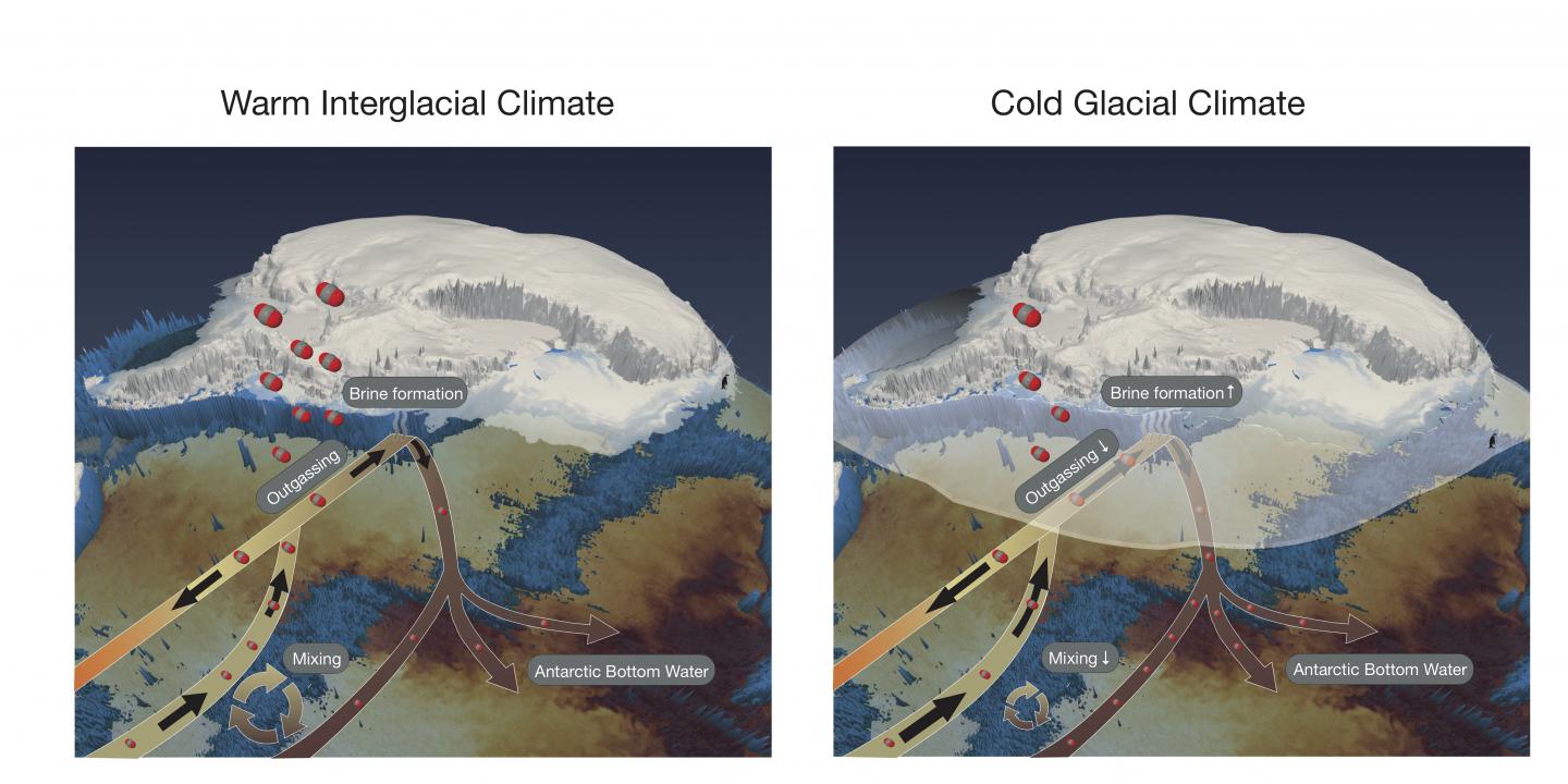 image: North-South ocean currents are shown at different depths in the ocean, with their strength and direction indicated by the arrows. The density of the water increases with depth, from low (orange) to high (brown). During cold climates (right), sea ice around Antarctica grows, preventing some outgassing of carbon from the ocean to the atmosphere. Also, brine formation increases, which causes the Antarctic Bottom Water to become more dense, decreasing mixing with waters above. The two processes result in more carbon stored in the deep ocean.