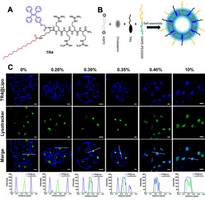 image: The development of TR4@Lipo with self-indicating property and its behaviors on cellular uptake when exposed to media containing different concentration of serum. (A) Molecular structure of TR4. (B) Schematic illustration of TR4@Lipo. TR4 generates blue fluorescence when incorporated into the liposomes. (C) Confocal images of MCF-7 cells after incubation with TR4@Lipo in the presence of different concentrations of FBS from 0% to 10%. The scale bar is 10 μm. Co-localization profiles are shown in the bottom panel.