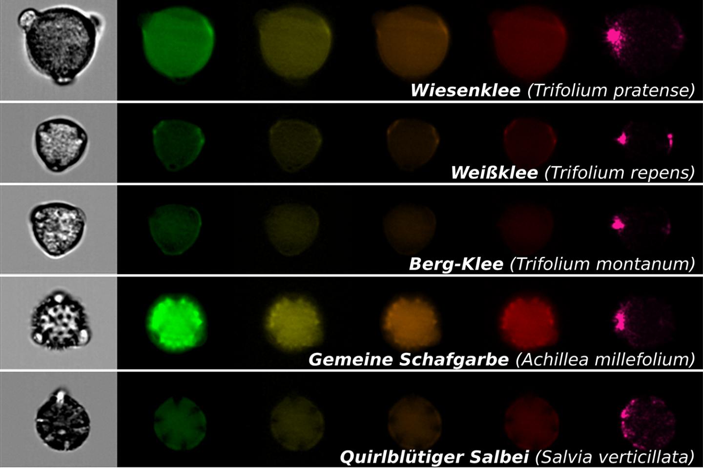 image: Microscopic images from pollen, which are important for pollinators, obtained by image-based particle analysis. Each row shows a single pollen grain of a specific plant with a normal microscopic image (first image on the left) and fluorescence images for different spectral ranges (colored images on the right).