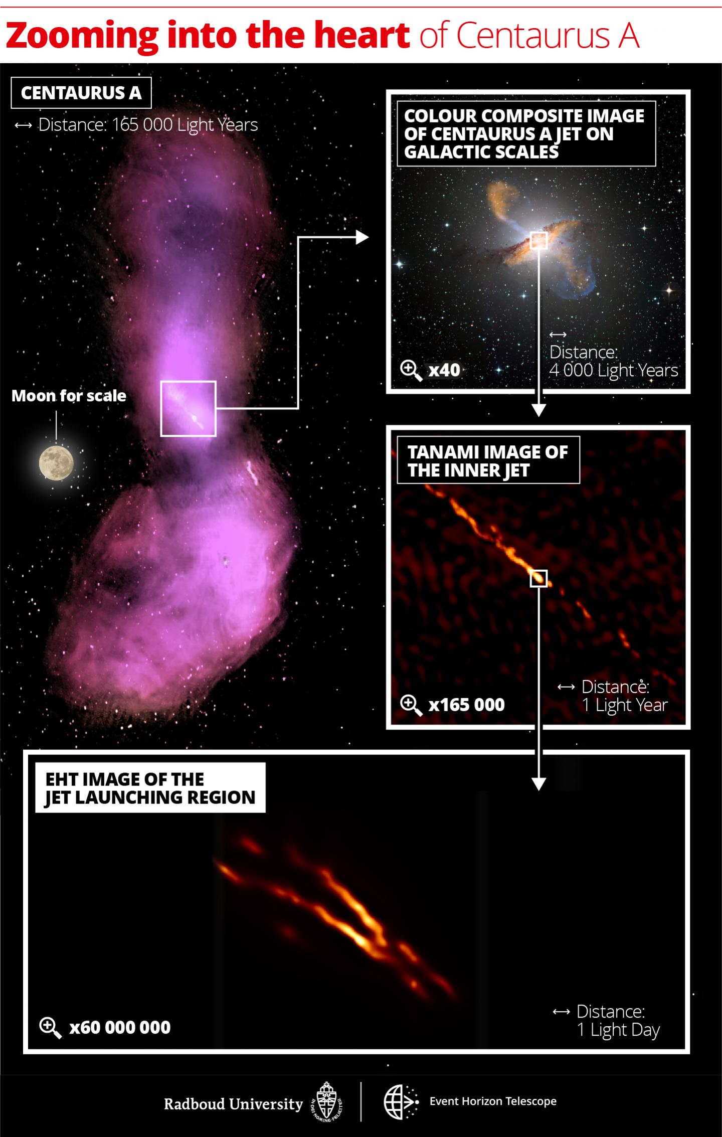 Compared to all previous high-resolution observations, the jet launched in Centaurus A is imaged at a tenfold higher frequency and sixteen times sharper resolution. With the resolving power of the EHT, we can now link the vast scales of the source, which are as big as 16 times the angular diameter of the Moon on the sky, to their origin near the black hole in a region of merely the width of an apple on the Moon when projected on the sky. That is a magnification factor of one billion.
