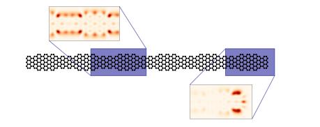 image: The graphene nanoribbon (center) consists of a single layer of honeycomb carbon atoms. The ribbon is only a few carbon atoms wide and has different electrical properties depending on its shape and width. The local density of the electrons is increased at the edges, as the dark red areas in the boxes show.