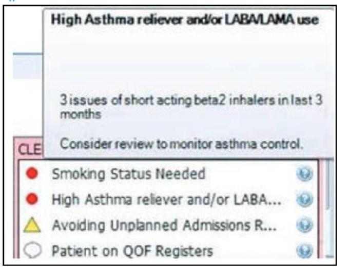 The alert pops up when GPs open the medical records for a patient who has been issued with three prescriptions for short-acting reliever inhalers, such as salbutamol, within a three-month period. It suggests the patient should have an asthma review to assess symptoms and improve asthma control. Short-acting beta2-agonists (SABAs), usually described as blue inhalers, afford short-term relief of asthma symptoms by expanding the airways, but do not deal with the underlying inflammatory cause.