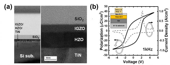 image: (a) Cross-sectional TEM image of a TiN/HfZrO2/IGZO capacitor. Each layer was uniformly formed. HfZrO2 layer is uniformly crystallized having ferroelectric phase. (b) Measured polarization charge versus voltage of a TiN/HfZrO2/IGZO capacitor. Clear ferroelectricity was confirmed.