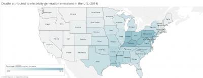 image: University of Washington researchers have found that air pollution from electricity generation emissions in 2014 led to about 16,000 premature deaths in the continental U.S. In many states, the majority of the health impacts came from emissions originating in other states. Shown here is a map of the U.S. where the states are colored according to the number of premature deaths per 100,000 people in that state. Darker colors represent more deaths. For an interactive version of this map, please visit: https://public.tableau.com/views/air-pollution-deaths-electricity/Dashbo...