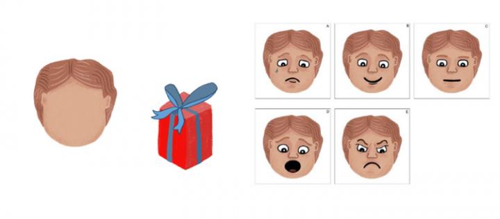image: Content of item 1 of the second part of the emotion awareness task. The instructions are as follows: left: This boy has just received a present for his birthday. Right: a) Show me the picture that matches his face. b) How does he feel at this moment?