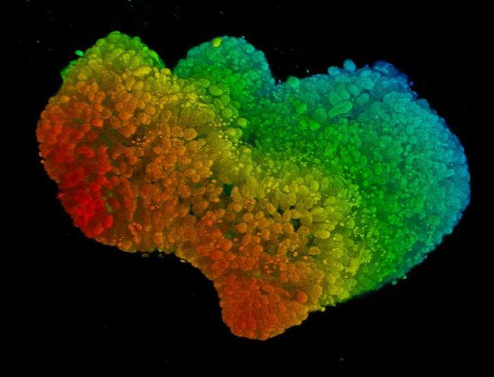 image: An organoid - a three-dimensional cell structure - grown from endometrial cancer tissue of a patient. The different colours indicate the depth of the microscopic scan.