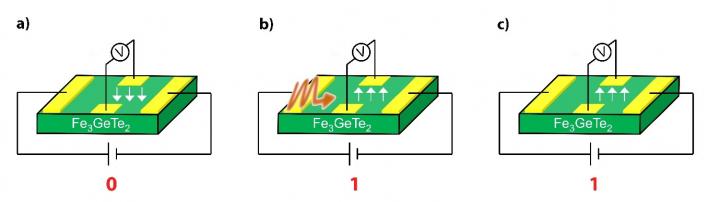 image: Schematic representation of Fe3GeTe2-based non-volatile memory prototype. Fe3GeTe2 is a ferromagnet, where its spins (little white arrows) align in the same direction. The orientation of the spins defines 1 or 0 binary bits. a) Initial state, where the information 0 is recorded. b) To write new information, a small current (orange arrow) is applied, which changes the material from a hard magnet to a soft magnet so that the stored information can be easily modified (say, from 0 to 1). c) Once the current is turned off, the material changes back to a hard magnet, and the information 1 written in the stage b) can be maintained for a long time without any external power supply, making it a non-volatile memory.