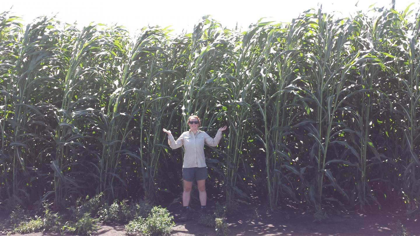 image: CABBI researcher Caitlin Moore, standing here in an Illinois sorghum field, was a lead author on a study that found annual energy sorghum behaved more like miscanthus than maize in the way it captured light and used water to produce abundant biomass. The work signals the plant's potential as a sustainable bioenergy crop.