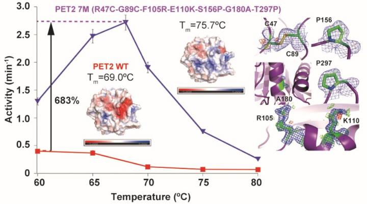 image: Mutations of a PET hydrolyzing enzyme PET2 resulted in a 6.7 degrees C increase in thermal stability and a 6.8-fold increase in PET hydrolytic activity. Tm represents melting (denaturation) temperature and colors on enzyme structures show their surface charges (blue: positive, red: negative).