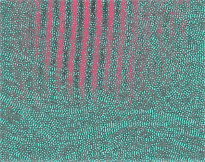 image: Adding antioxidants can push the resolution limit of polymer electron microscopy to reveal a structure smaller in scale (blue) compared to the structure previously observed (pink) in this false-color image.