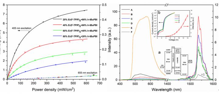 image: (Left) The emission intensity per percentage Er3+ at 1532 nm as a function of laser power density for Ir-tBuPBI co-doped film with different molecular concentrations of Er(F-TPIP)3. The solid line represents 405-nm excitation, and the dashed line represents 655-nm excitation. (Right) The EL spectra of OLEDs with different molecular ratios of Ir-tBuPBI:Er(F-TPIP)3 driven with 14 V. 5% Er(F-TPIP)3+95% Ir-tBuPBI (A), 10% Er(F-TPIP)3+90% Ir-tBuPBI (B), 30% Er(F-TPIP)3+70% Ir-tBuPBI (C), 50% Er(F-TPIP)3+50% Ir-tBuPBI (D), 100% Ir-tBuPBI (E) and 10% Er(F-TPIP)3+90% AlQ3 (F).