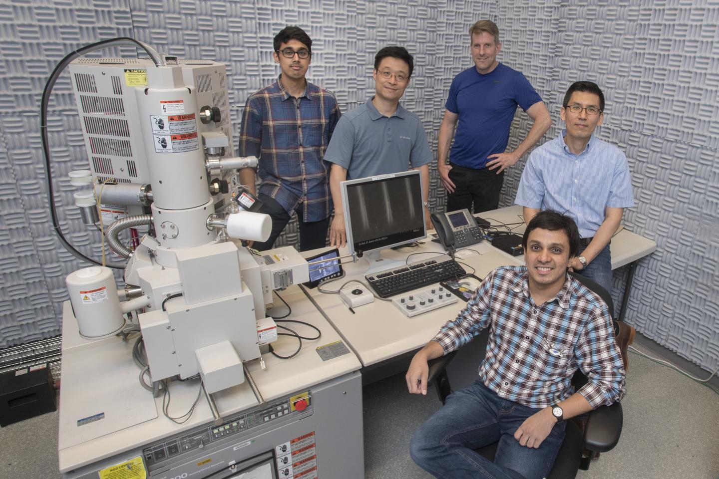image: (Left to right): Ashwanth Subramanian, Ming Lu, Kim Kisslinger, Chang-Yong Nam, and Nikhil Tiwale in the Electron Microscopy Facility at Brookhaven Lab's Center for Functional Nanomaterials. The scientists used scanning electron microscopes to image high-resolution, high-aspect-ratio silicon nanostructures they etched using a "hybrid" organic-inorganic resist.