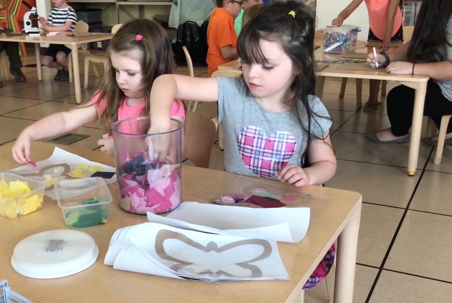 image: Young participants at an enrichment program at the Phipps Conservatory and Botanical Gardens work on a hands-on collage activity as part of the 'A Bug's World" program.