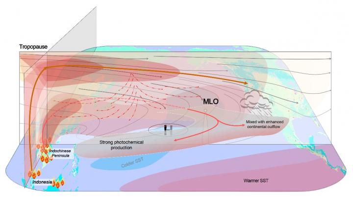 The study further applied a global-scale numerical model to explore the mechanism and to quantify the impact based on a series of experiments. It shows that both the ENSO-induced anomalies in circulation and enhanced vegetation fire emissions in Southeast Asia make stronger contributions to the ozone and carbon monoxide anomalies stretching from subtropical Asia to North America in El Niño spring. However, the year-to-year difference in vegetation fire emissions modulated by ENSO makes a stronger contribution than the anomalies due to meteorological variability alone. The study also reveal completely different transport pathways of the enhanced fire emissions from Indochina Peninsula and Indonesia over the Pacific Ocean: via lower-mid troposphere and upper troposphere, respectively.